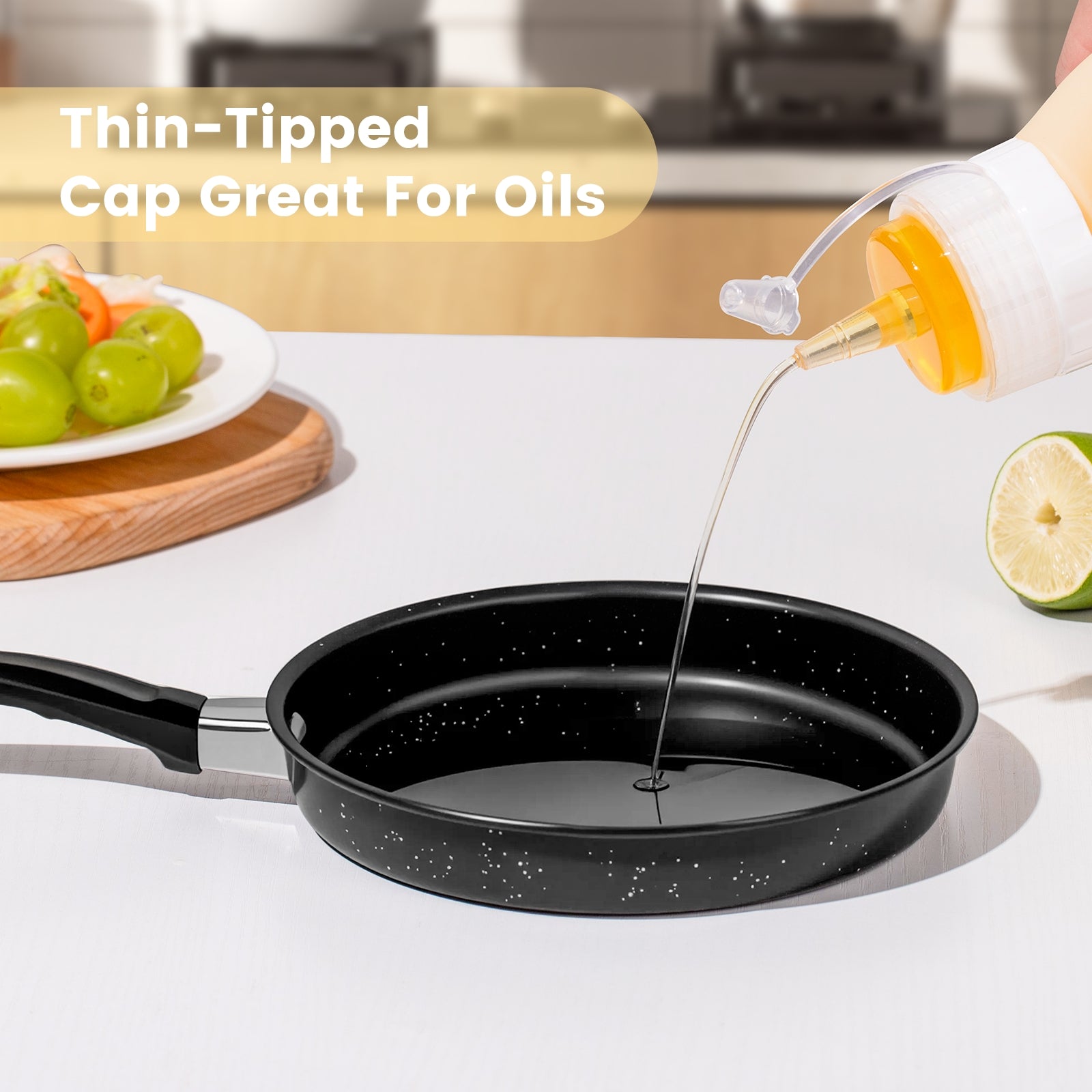 Leak-proof Cap: condiment squeeze bottles are built with a high-tech leak-proof design. Perfect as oil bottle, syrup bottle, oil dispenser, salad dressing bottle, ketchup squirt bottle.