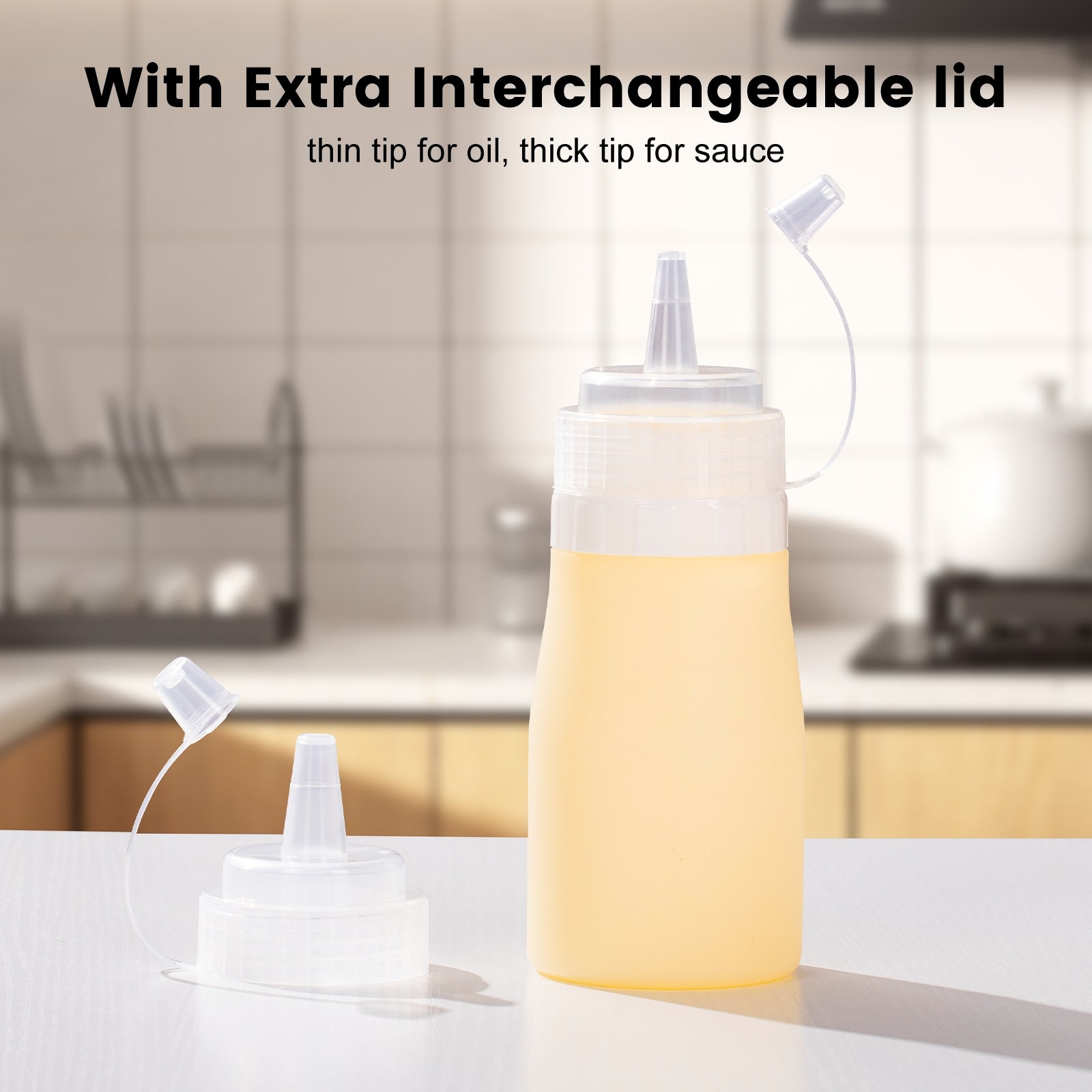 With Extra Interchangeable lid: Thin tip for oil, syrup and marinades, Thick tip for condiments and sauce